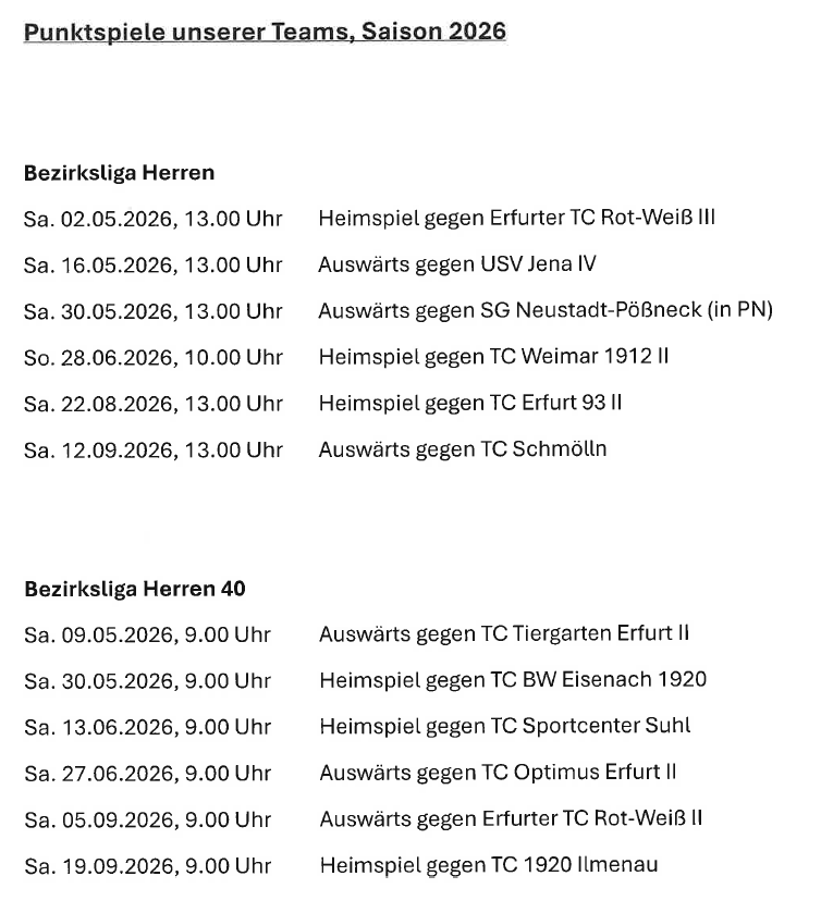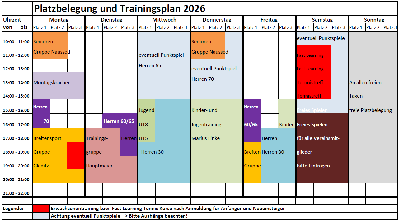 Hier findet Ihr den aktuellen Trainings- und Platzbelegungsplan unserer Tennisanlage.