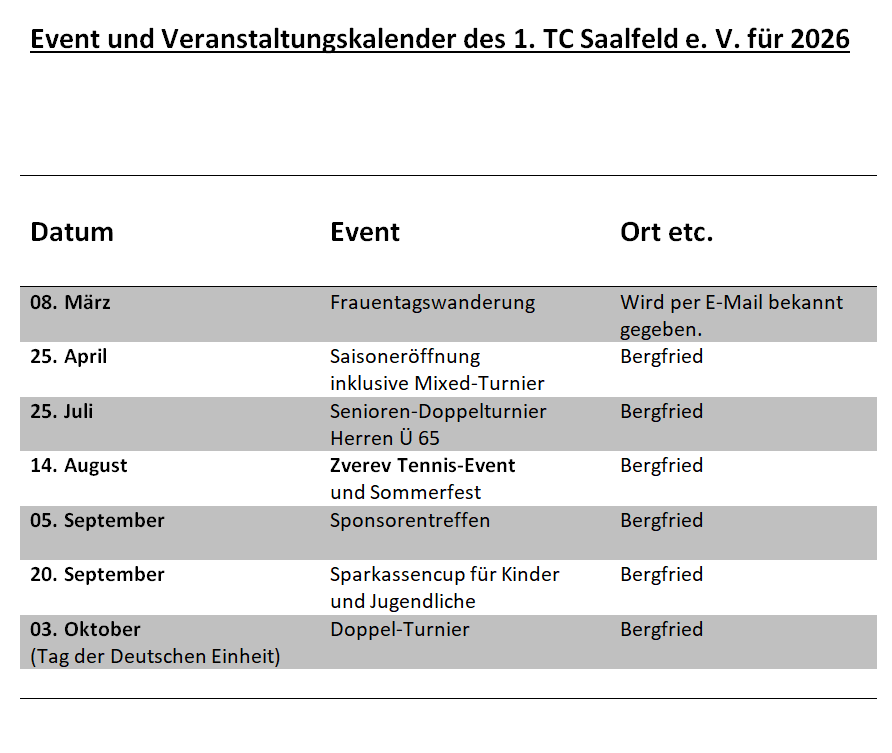 Turniere und Veranstaltungen Tennisclub Saalfeld Veranstaltungen 2025 04. April 2024 Veransaltungskalender Hier findet Ihr immer die neuesten Veranstaltungshinweise unseres Tennisvereins!